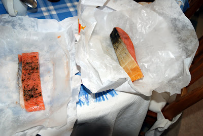 One of the more interesting ingredients picked up was Lax (Salmon). Robert bought two kinds... Kall Rokt Lax (Cold Smoked Salmon) and Gravad Lax (Burried Salmon). Of the two, Robert preferred the Gravad Lax. Andree is describing the Salmon preparation techniqes here now: