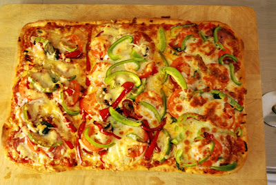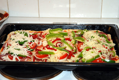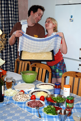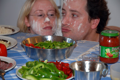 Tonight Nina and Robert cooked up a special treat for the wedding party planners. PIZZA! Starting at 2pm and working until about 9pm they sliced diced and chopped their way into the pizza making annals of history. It was a massive undertaking with a "design your own" topping selection. Nina and Robert chopped veggies, fruit, and meats for hours. Then pre-fried, and steaked some of the ingredients... Plus they made their own pizza dough complete with one to two hours of rising time for the dough. Nina was in charge of creating "zones" for each family member in which each person was allowed to customize his or her own topping arrangement. The result was some truly tasty pizza! Here are some shots of the lovebirds preparing the meal and some glory shots of the final product...